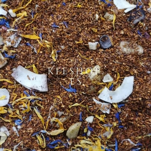 Rooibos, acai en polvo, piña, semillas de guaraná, mango, chips de coco, plátano, aciano azul, caléndula.